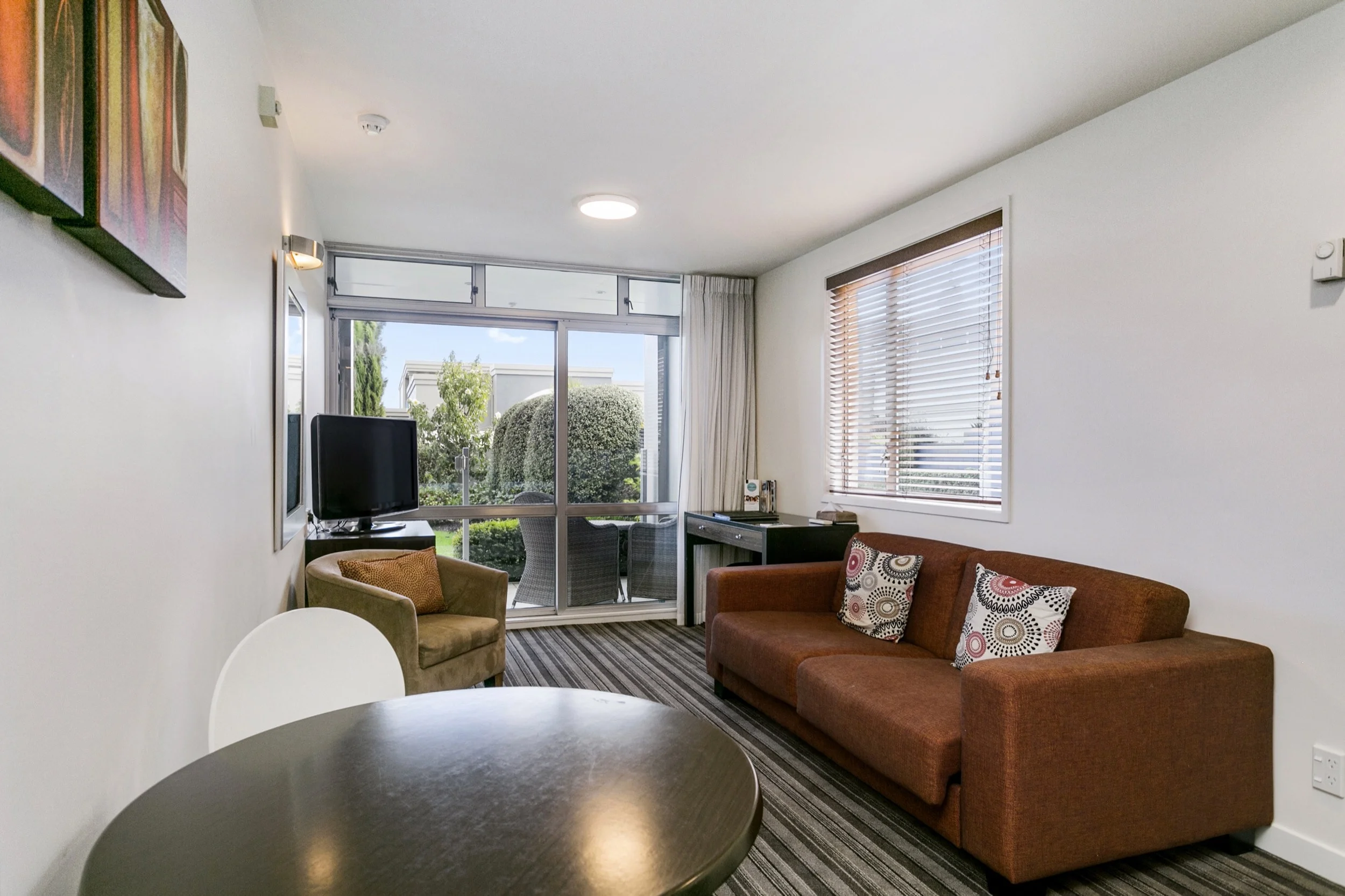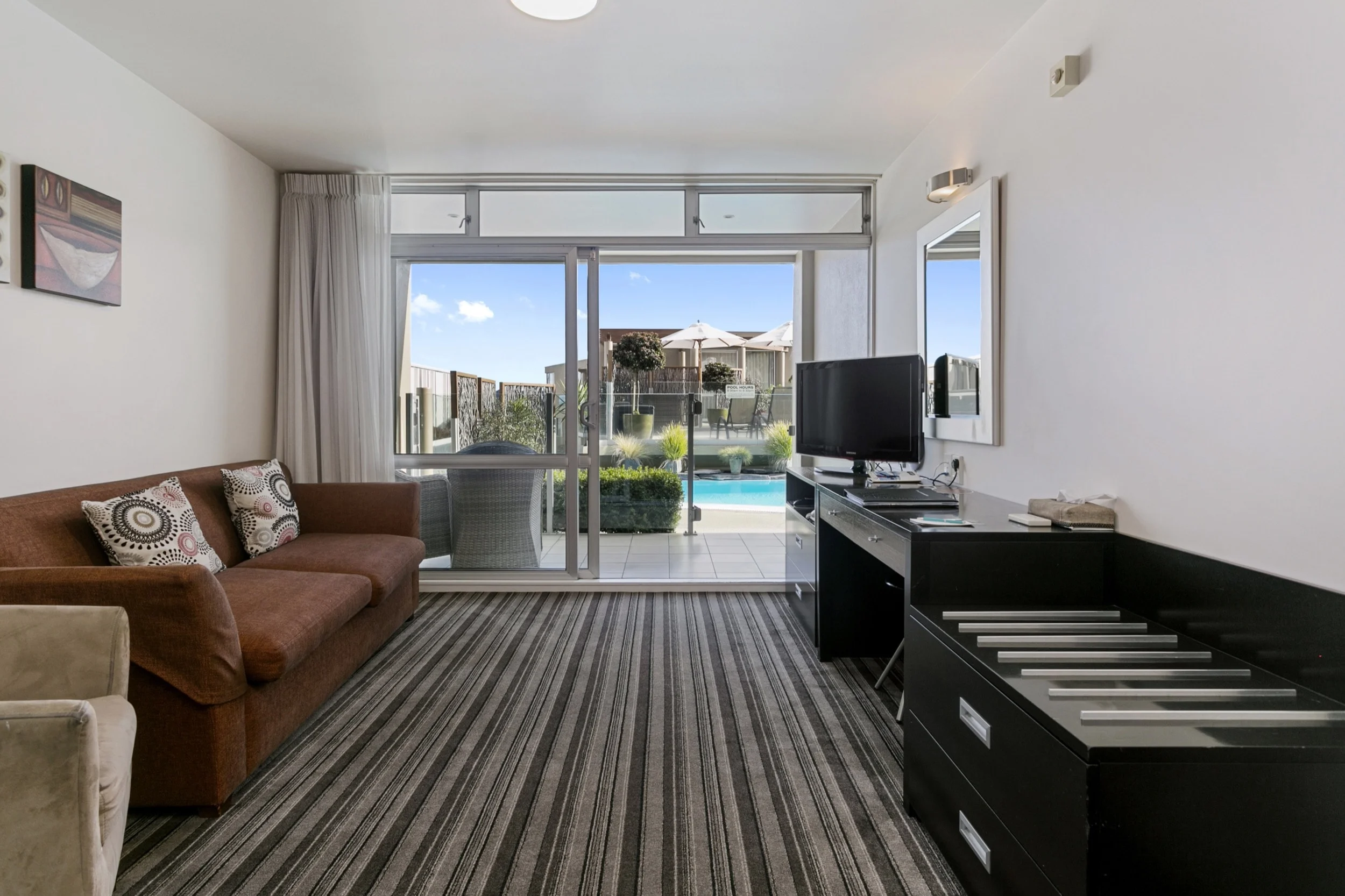 These large, luxurious one bedroom units have direct access to the pool area with heated fresh water pool and naturally heated thermal spa pool. A large open plan studio that has a king size bed in the bedroom, double sofa bed in the lounge, kitchenette and table & chairs. These units have two bathrooms, one with a spa bath and a shower over the bath and the second bathroom has a wet floor shower. The private patio that opens onto the pool area has outdoor table & chairs and a sun lounger.